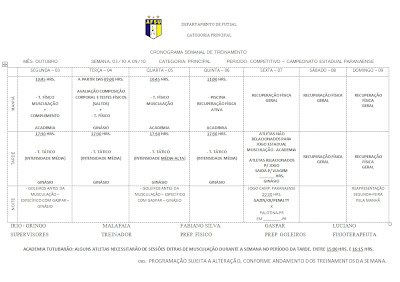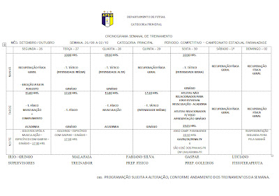 O restante da semana está programada com turnos de treinamentos técnico-táticos, com o prof. Malafaia, e também turnos de recuperação física passiva (repouso) e ativa (piscina), finalizando com o jogo no sábado.